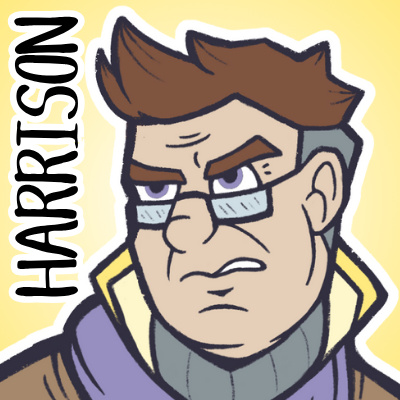 Harrison is almost never seen wearing short-sleeved clothing, instead favoring a gray turtleneck sweater, a beige overcoat with yellow trimming, black dress pants, brown work boots, and a purple scarf. Somewhat far-sighted, he will occasionally don a pair of rectangular reading glasses.